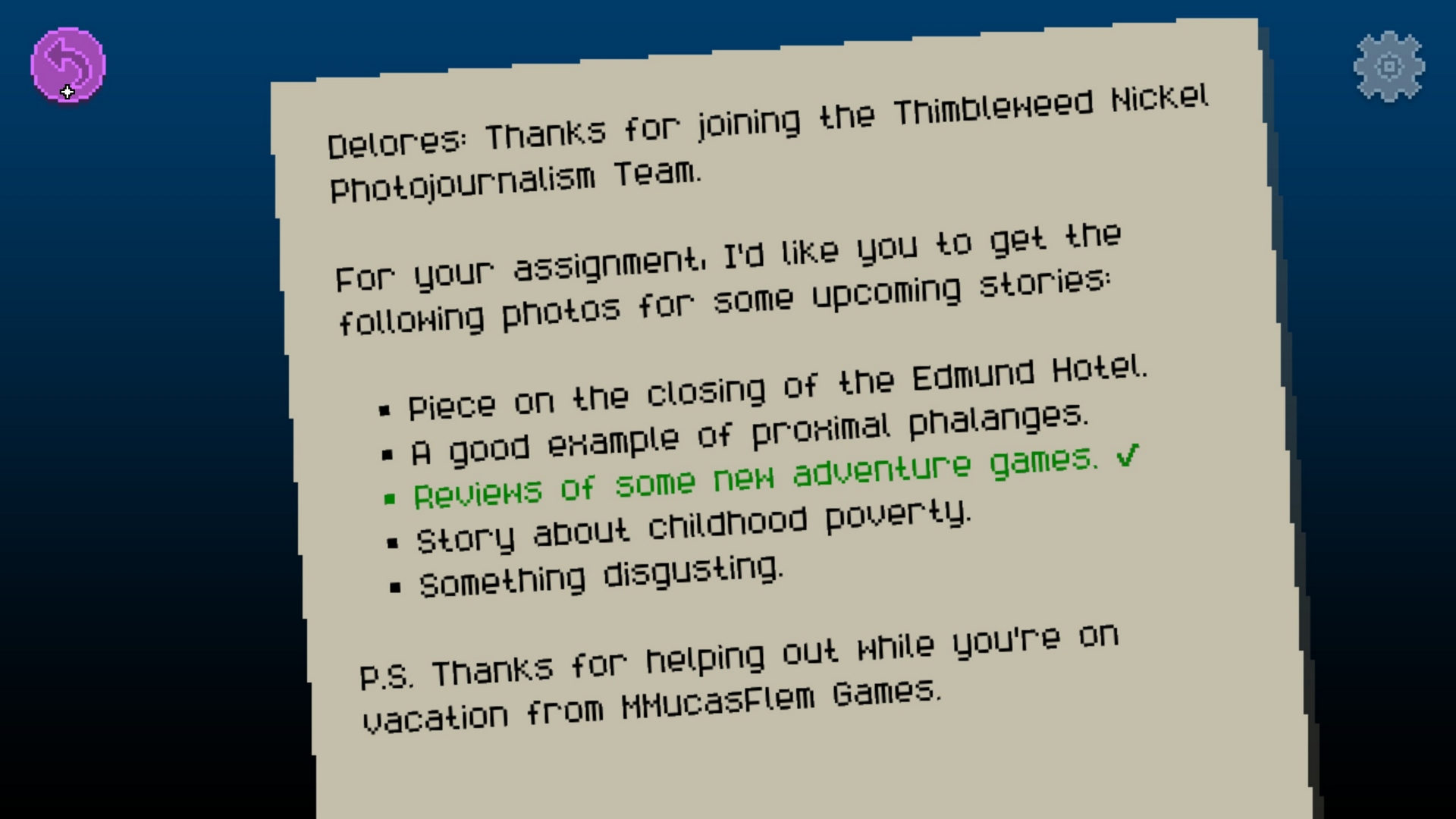 At the start of the game, Delores is given an assignment list of five photos needed to accompany specific local news stories. This photographic scavenger hunt makes up the bulk of the gameplay, requiring players to explore the town, interact with residents and solve little puzzles in order to take the correct pictures.