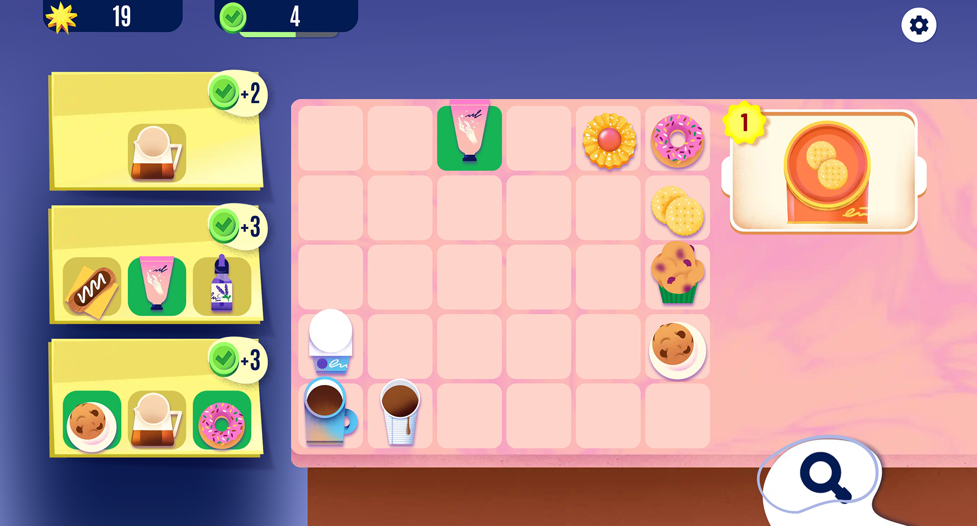 A further requirement for progression is green ticks which are collected in an entirely different section of the game. At the end of each hidden object task, the player is awarded a set of packs, either wellness, pies or coffee which will have a number of items within them. The better the score the more items will be in the packs. The items need to be unpacked into a grid where they can be combined to make new items, with the UI showing which combination of items is required, and when the player completes the combo, green ticks are awarded. Due to this mechanic, it is often necessary to keep playing the hidden object games within existing scenes in order to get enough packs to receive the required number of ticks. While this extends the gameplay, the lack of variation in scenes and objects can feel repetitive and often quite easy due to familiarity.