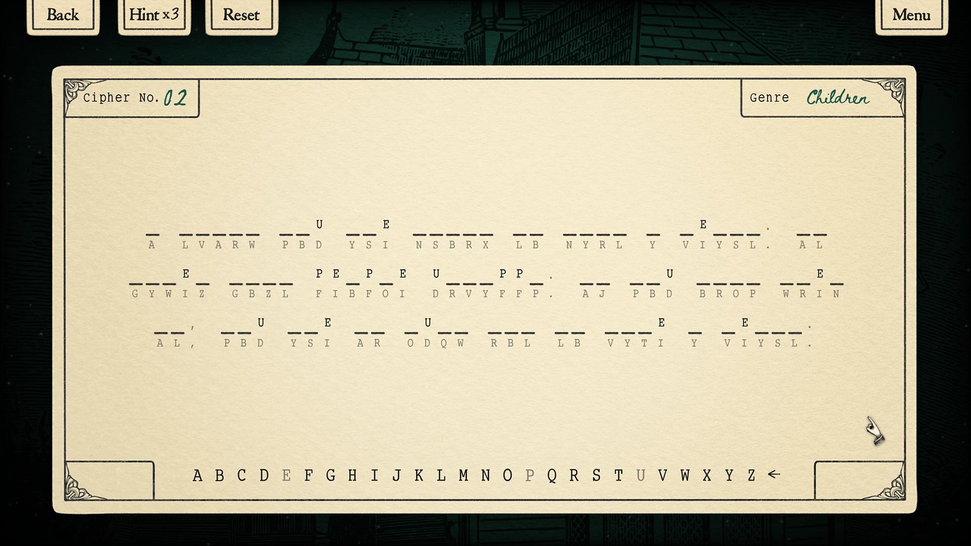 The controls are simple, the mouse can be used to navigate most things and letters must be typed using the keyboard. It is also possible to move between unsolved letters using either tab or the arrow keys. Prose and Codes is very accessible with multiple difficulty settings, a comprehensive tutorial, options for larger text and a dark mode as well as a number of hints for each cipher (3 in normal difficulty).